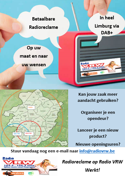 Het grote succes van de radio? Waar je ook komt, overal staat er wel ergens een radio afgestemd op Radio VRW 104.9 -106.3 Mhz, www.radiovrw.be en DAB+. Neem gerust contact op met huidige adverteerders en u hoort het zelf.